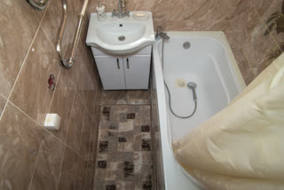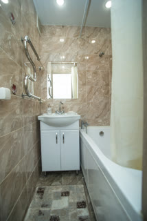 Современная ванная комната: акриловая ванна, новая сантехника, стильный кафель.